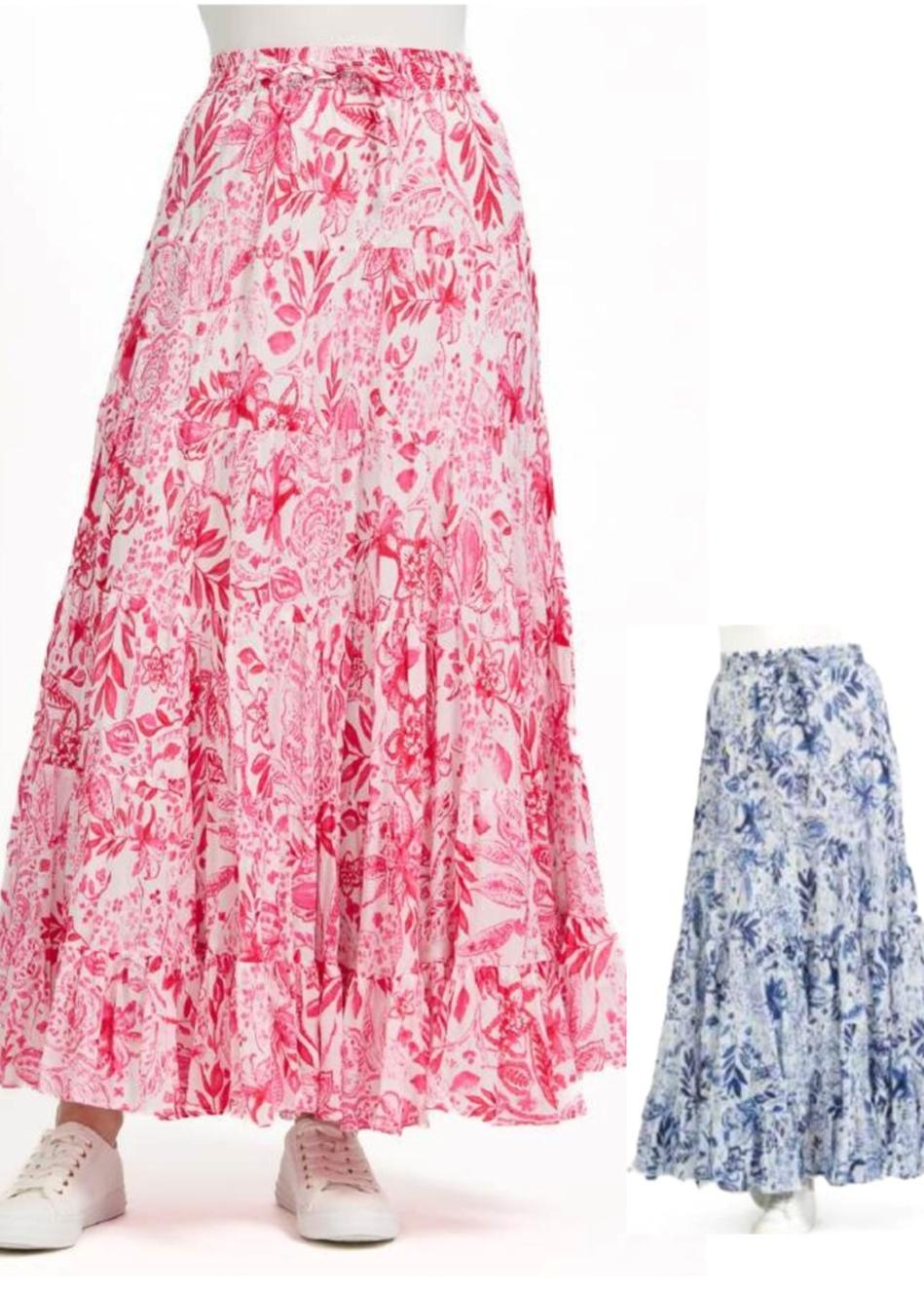 Floral print pattern tiered maxi skirt available in pink or blue.